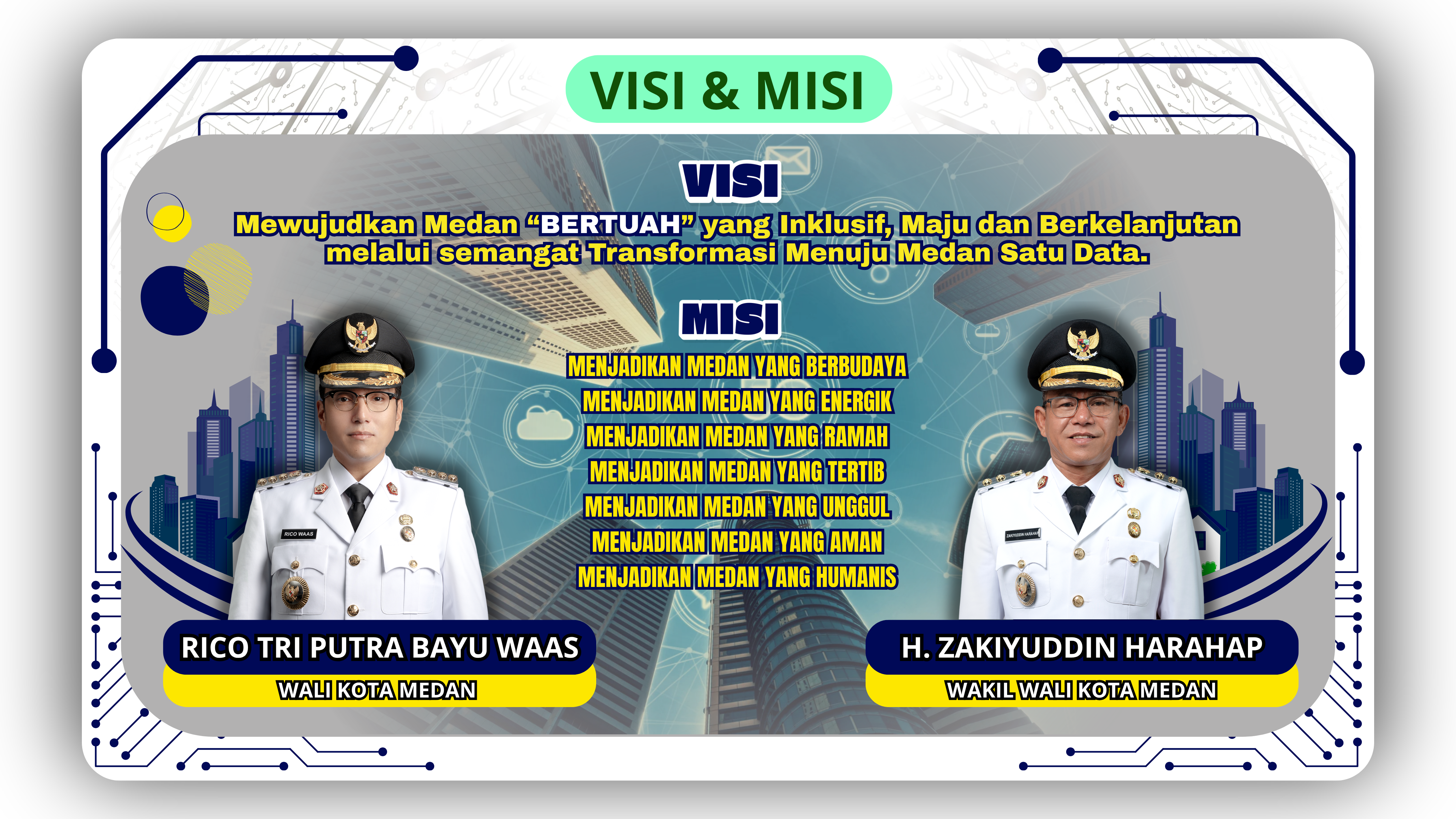Medan Smart City adalah Kota yang berfungsi secara maksimal dalam mengelola berbagai sumber daya Kota secara efektif dan efisien untuk menyelesaikan berbagai tantangan dan problematika Kota menggunakan solusi yang inovatif, terintegrasi dan berkelanjutan dimana teknologi menjadi pendorong terciptanya solusi tersebut ditopang infrastruktur yang kuat dan sumber daya manusia yang siap untuk memberikan layanan Kota yang dapat meningkatkan kualitas hidup warganya yang nyaman dan dicintai......